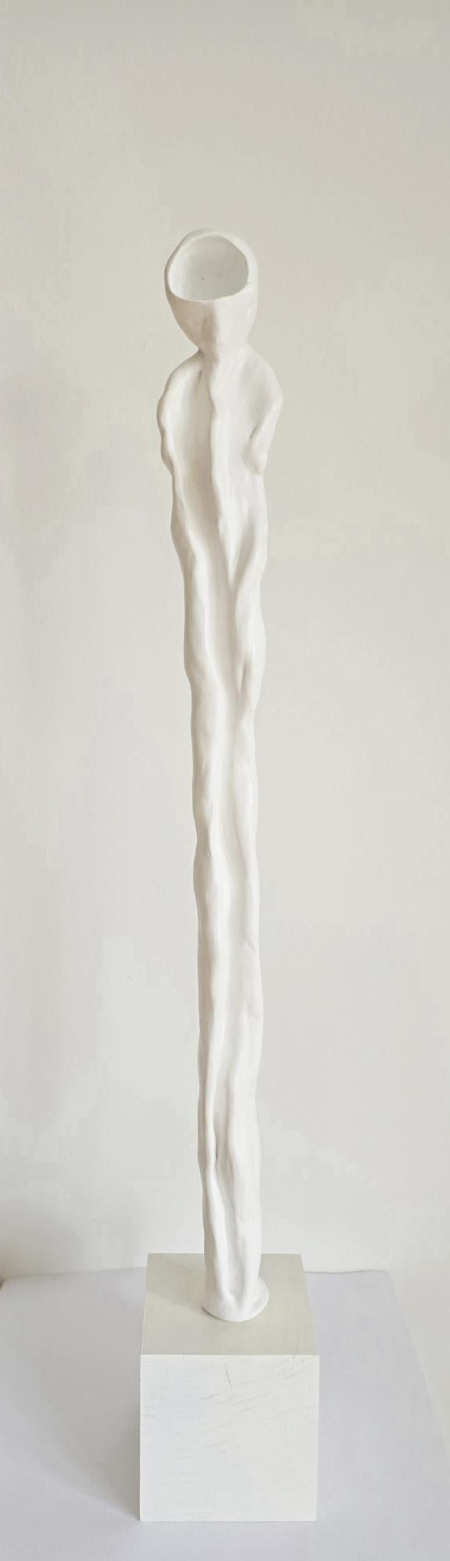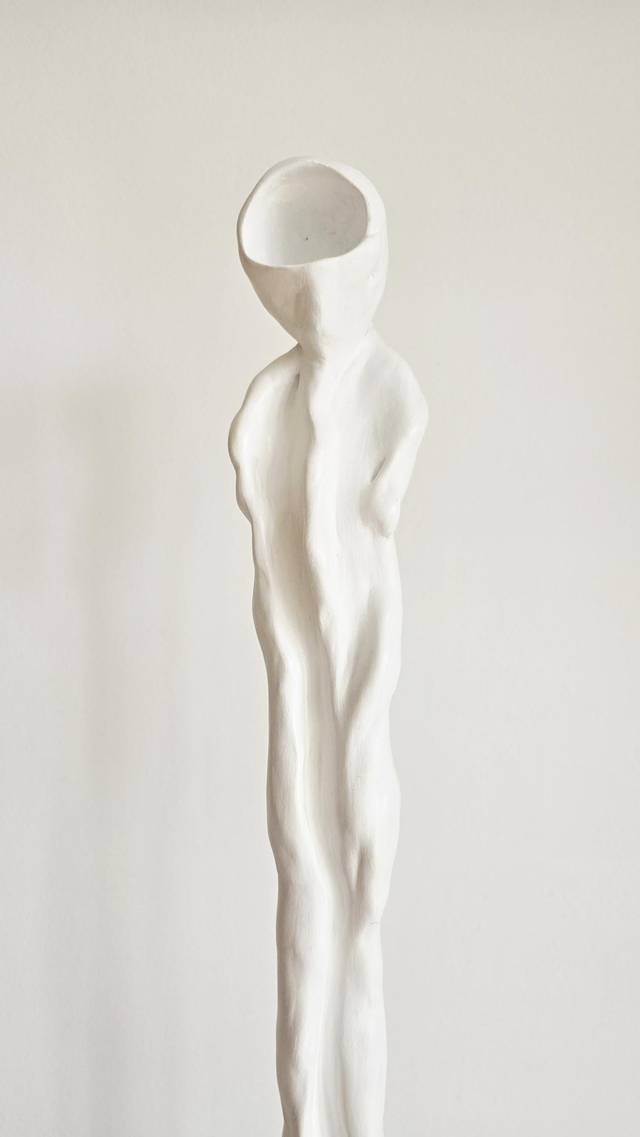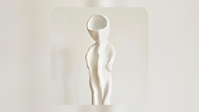 Personnage sans visage dont le corps laisse entrevoir, par un subtil mouvement, une émotion qui pourrait l'habiter.
