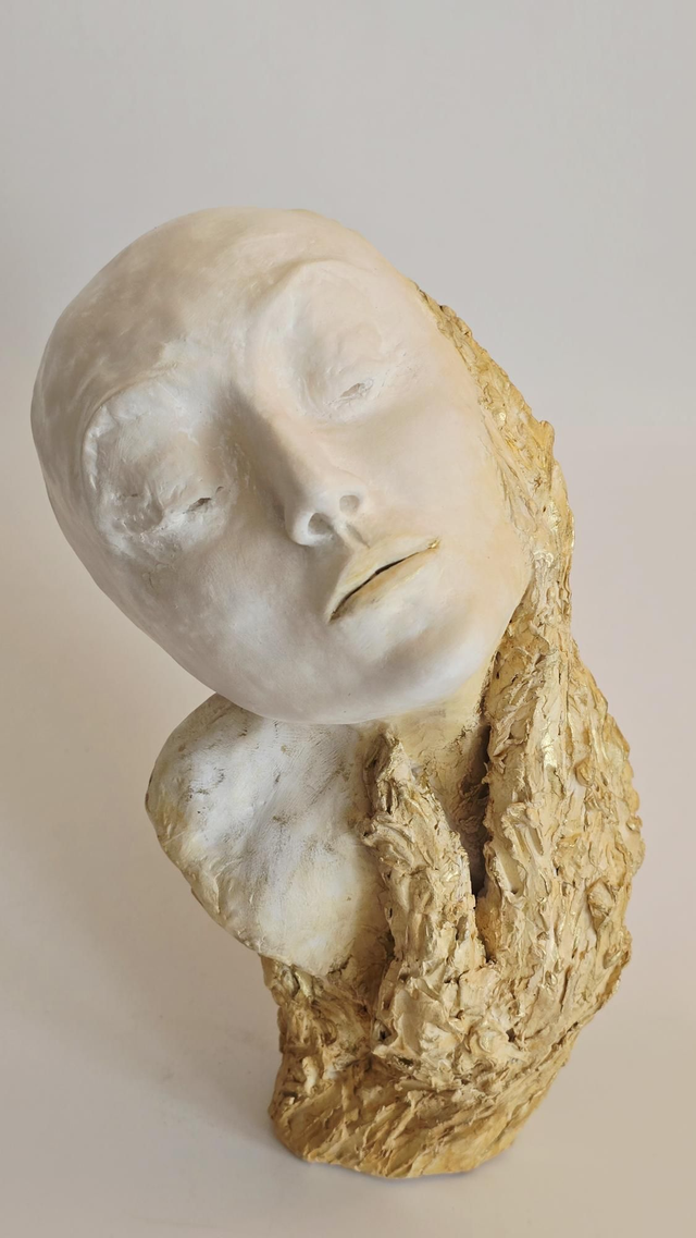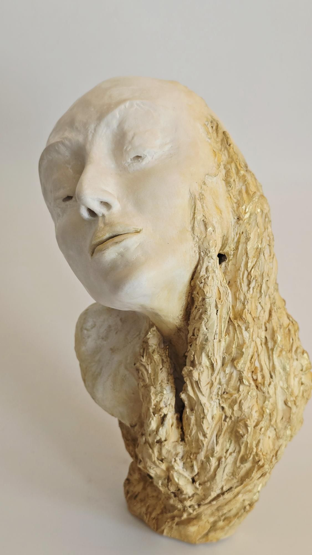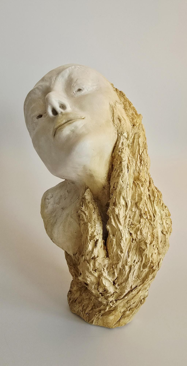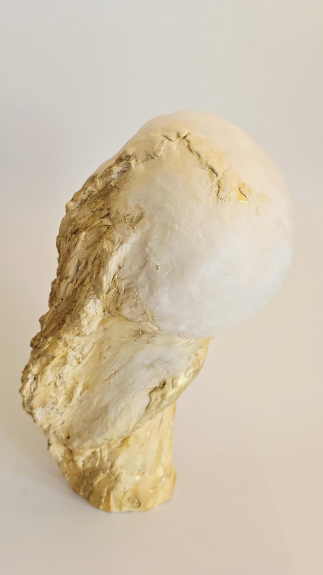 Sculpture réalisée en terre de grès lisse blanche et patinée aux pigments et à la cire.