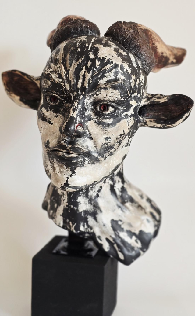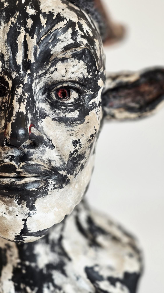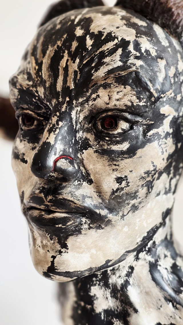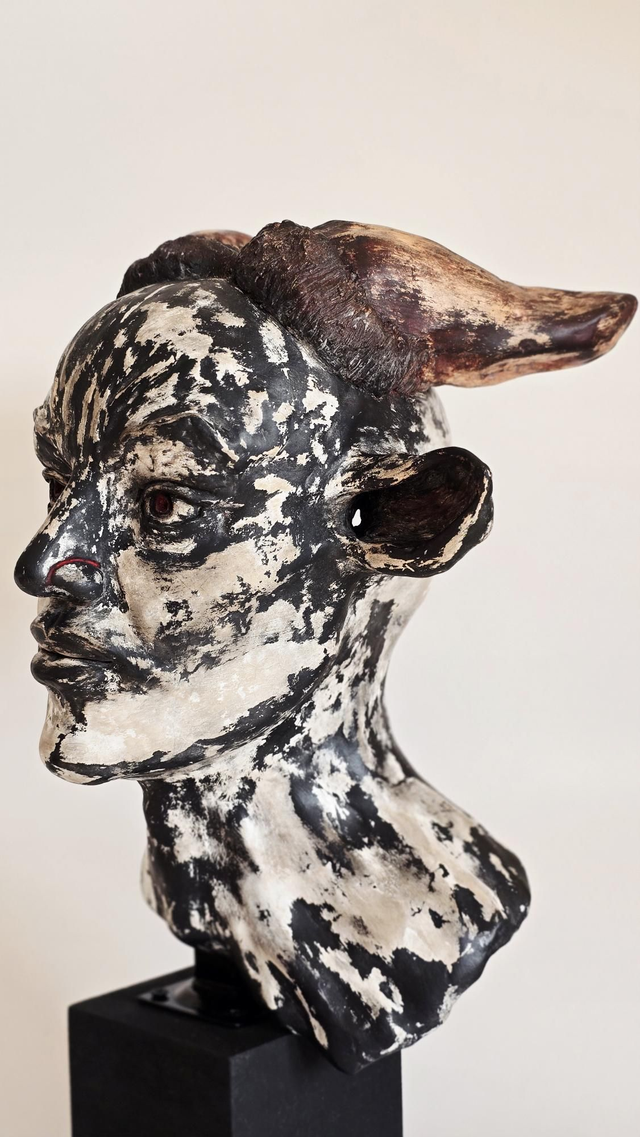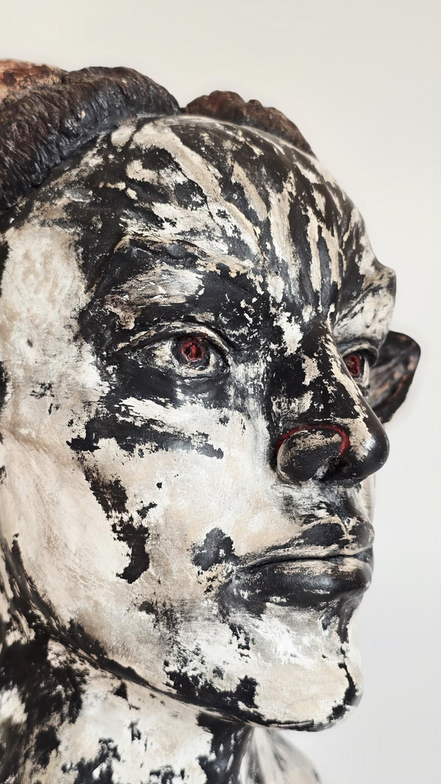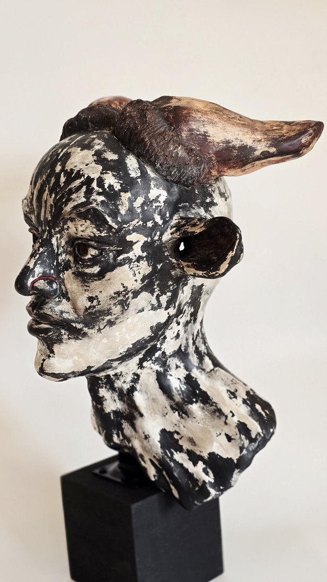 Sculpture en terre de faïence lisse blanche et patinée aux pigments et à la cire