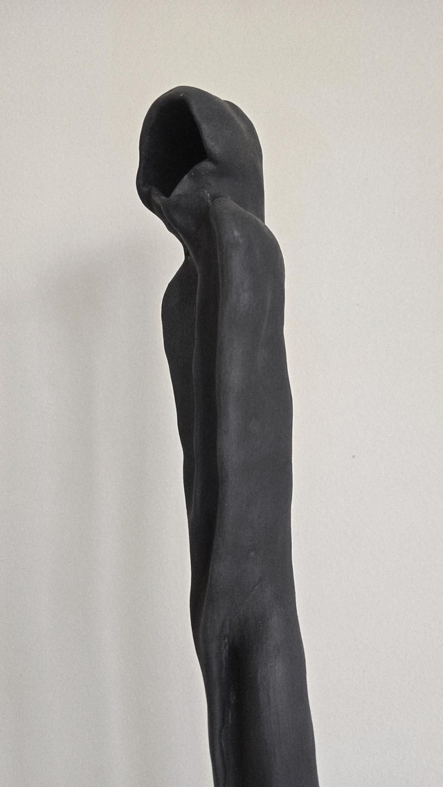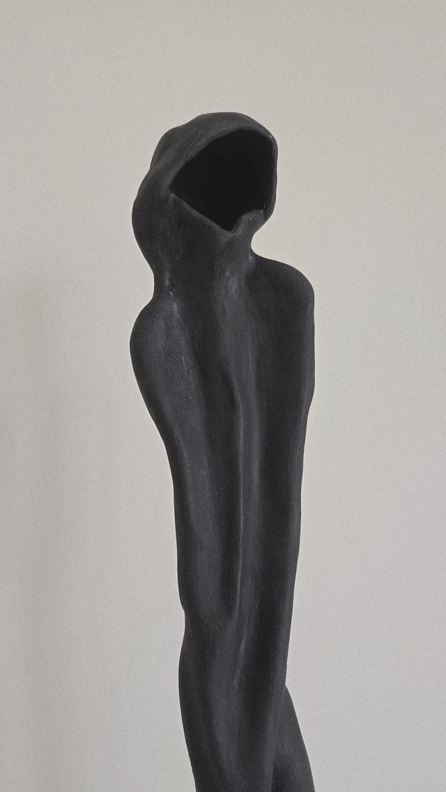 Personnage sans visage dont le corps laisse entrevoir, par un subtil mouvement, une émotion qui pourrait l'habiter.