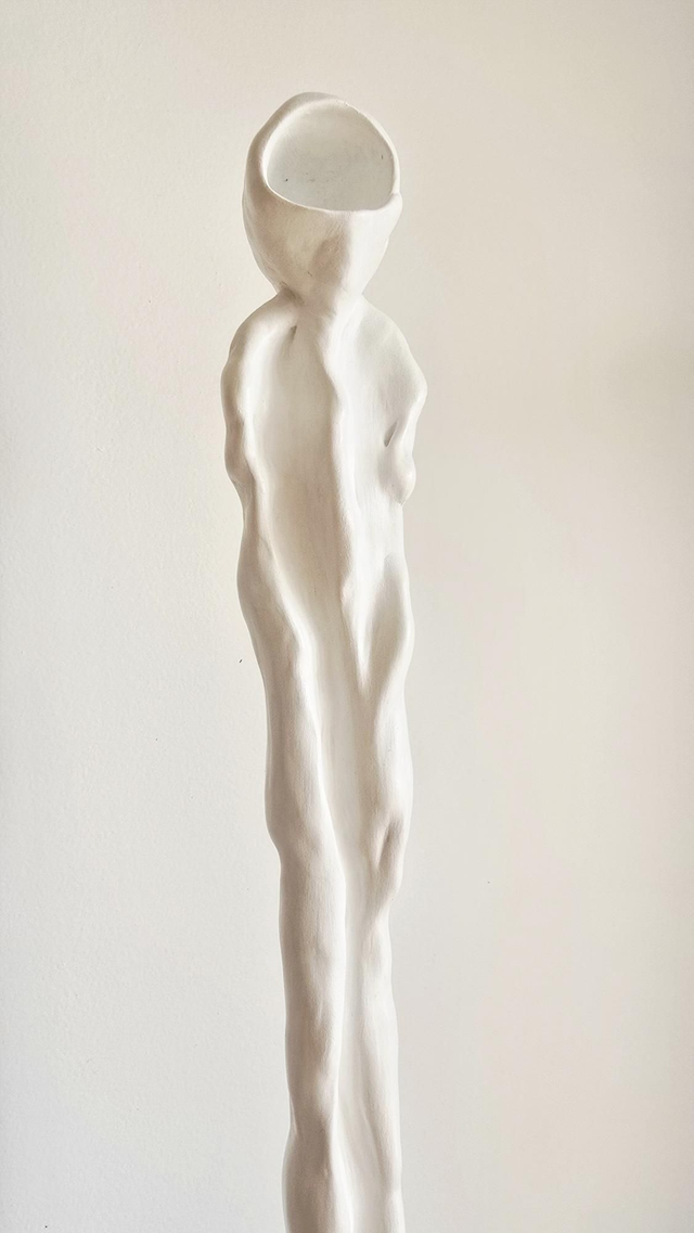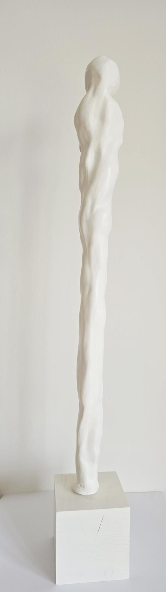 Personnage sans visage dont le corps laisse entrevoir, par un subtil mouvement, une émotion qui pourrait l'habiter.